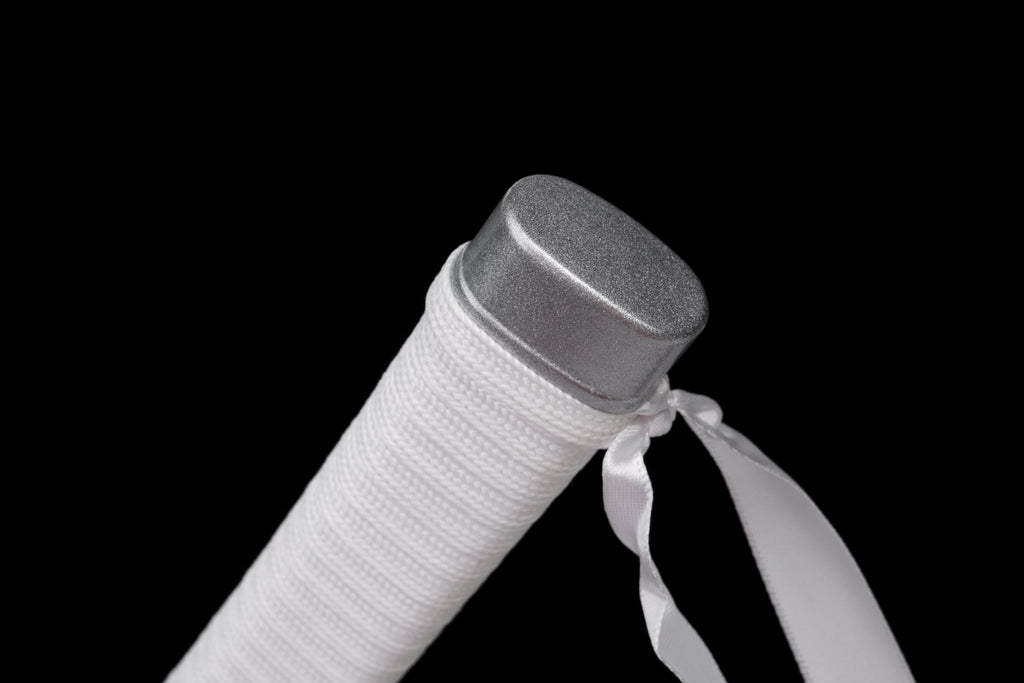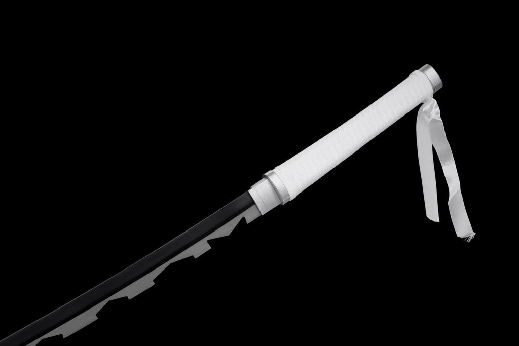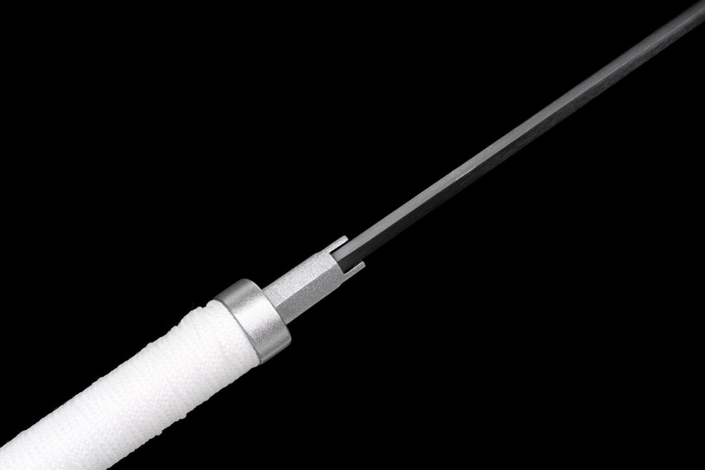 Greppet (Tsuka 柄) : Greppet är insvept i vitt ito över en kärna av tålig legering och säkerställer ett fast grepp som kompletterar svärdets djärva estetik.