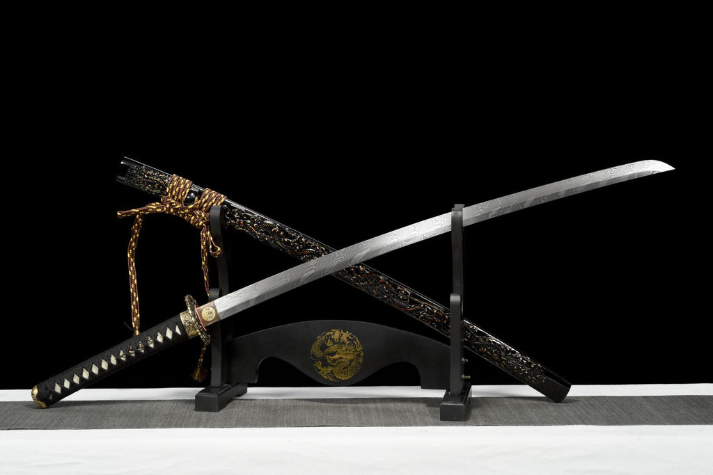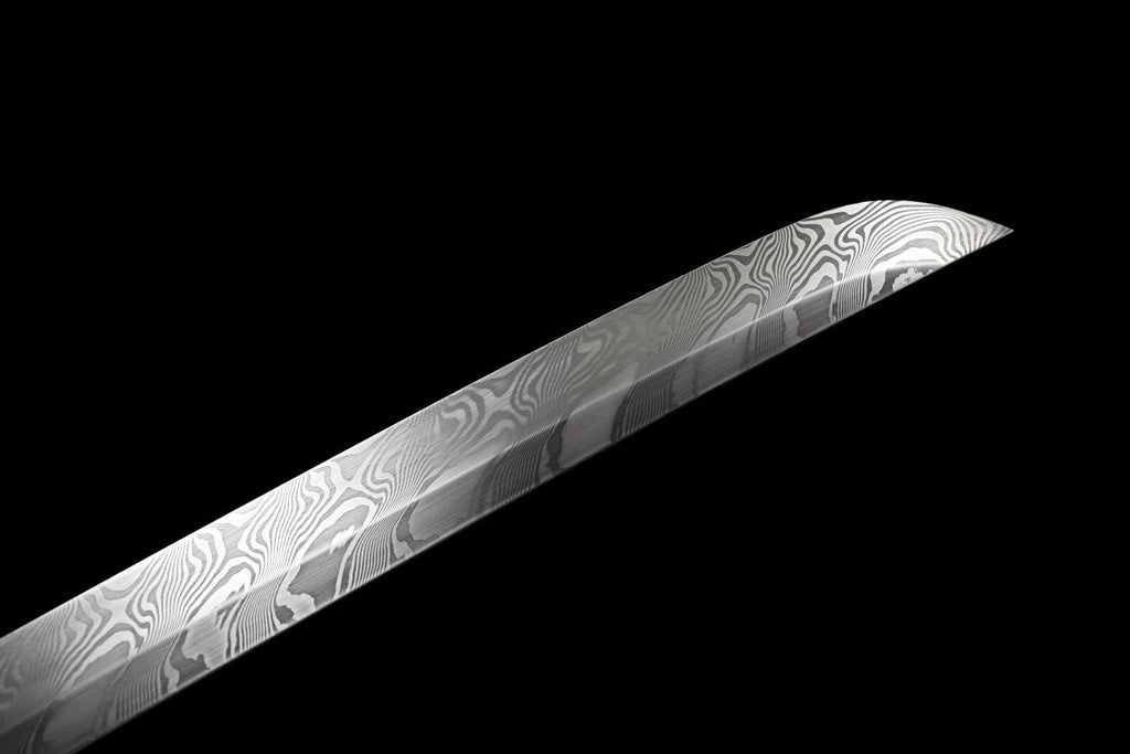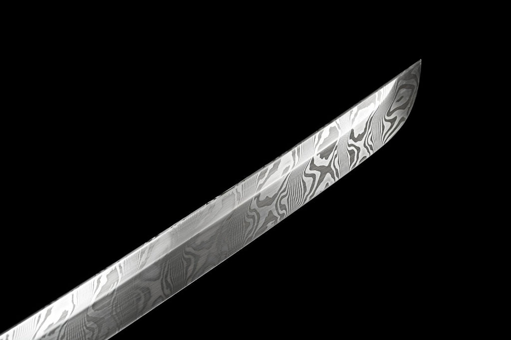 Denna katana, med sitt blad av damaskusstål, är ett exceptionellt stycke som förkroppsligar styrkan och delikatessen hos japansk svärdskonst. Den representerar en perfekt blandning av forntida traditioner och modern prestanda.