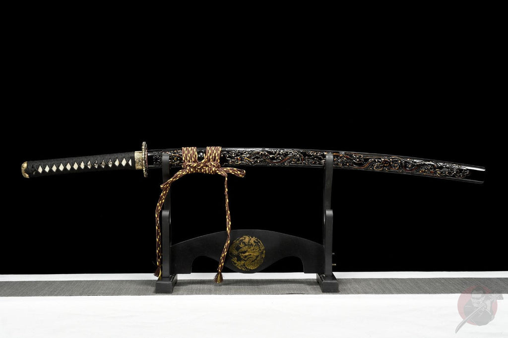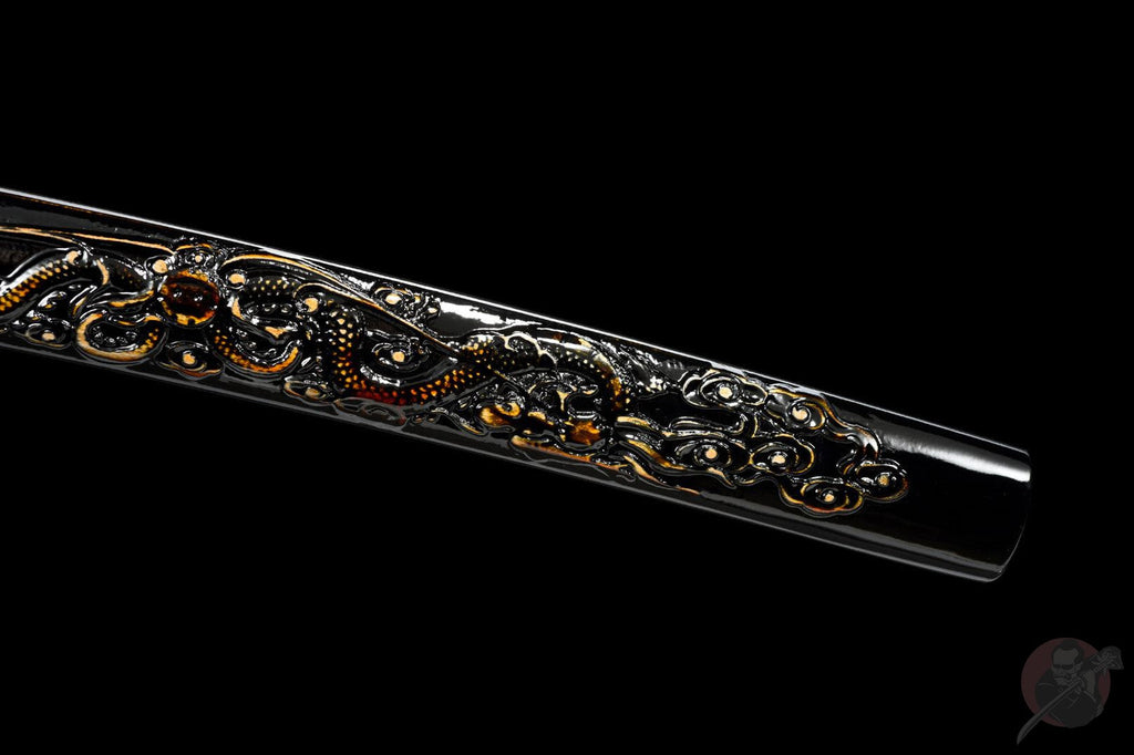 Saya: Den elegant skulpterade svarta slidan är tillverkad av lätt, lackerat trä. Den skyddar bladet samtidigt som den ger en touch av sofistikering med sitt delikata arbete och traditionella motiv.