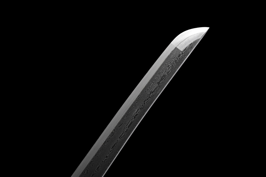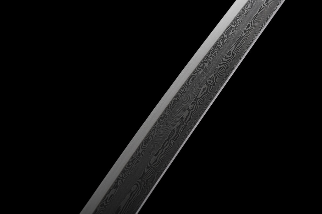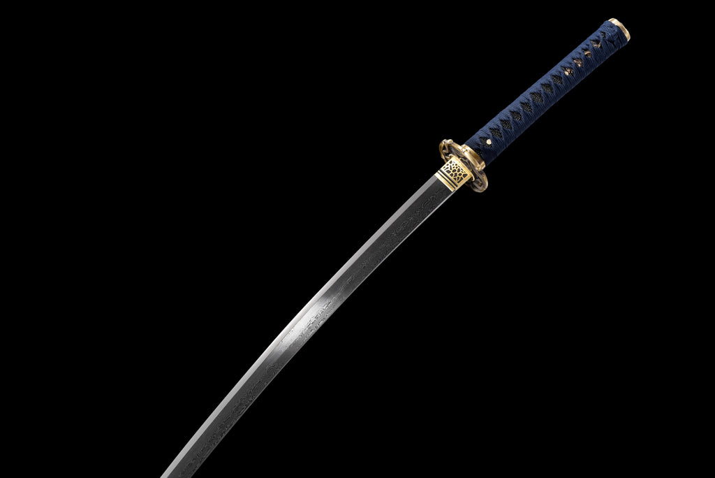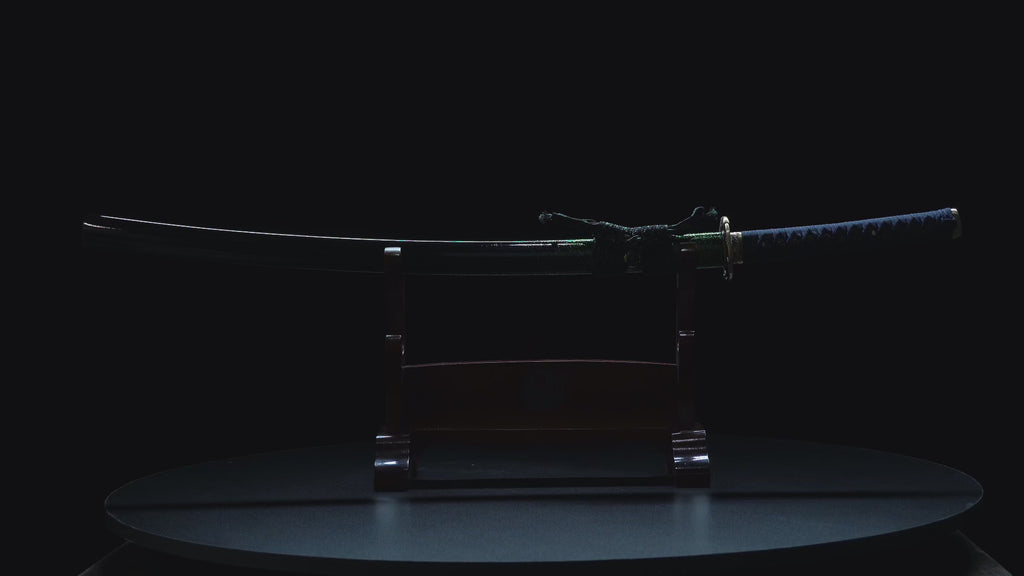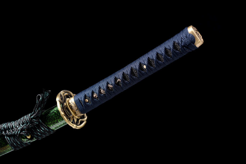 Denna katana har en mycket unik visuell komposition. Bladet är tillverkat av damaskus, slidan är målad i grönt som gränsar till svart, och sagean är tvåfärgad. Dess tsuba är också mycket speciell tack vare sin snidade mässing.