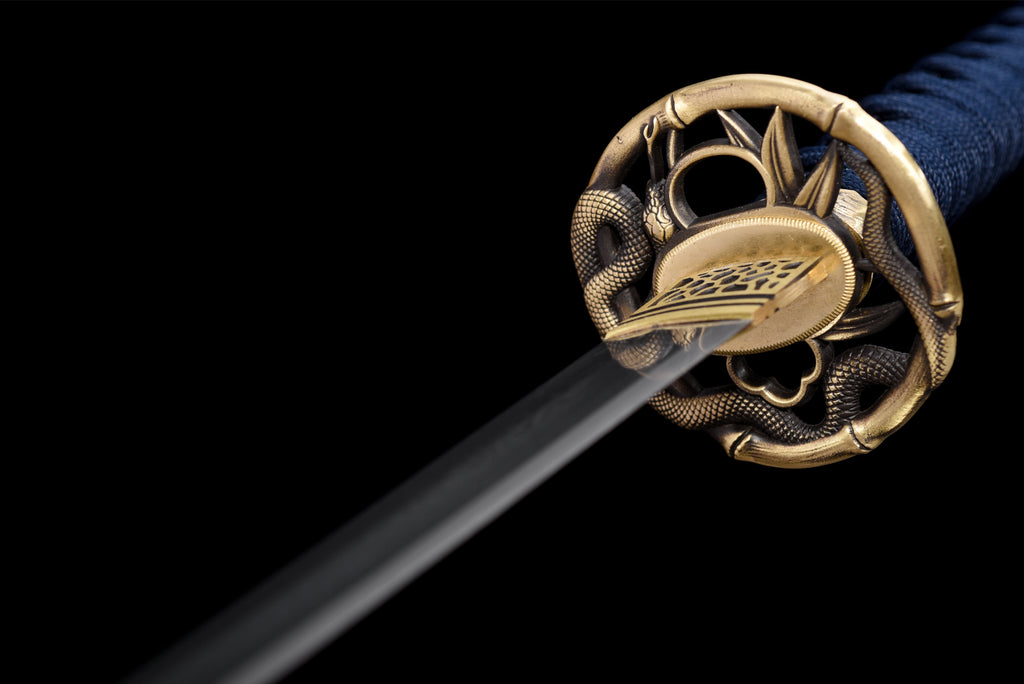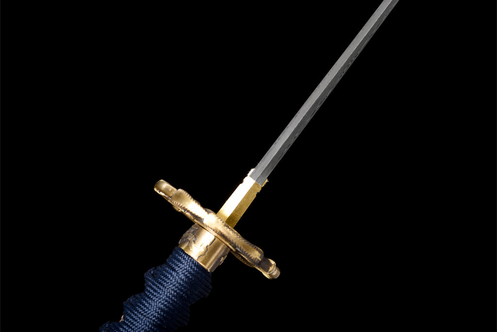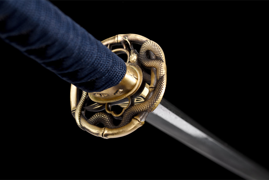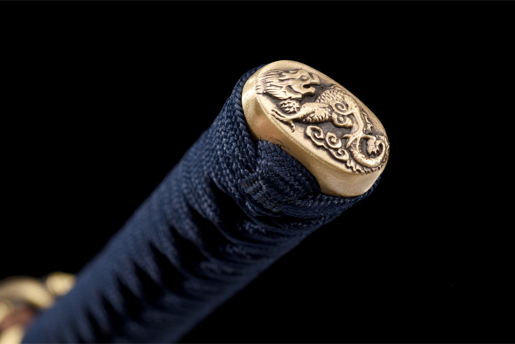Denna katana har en mycket unik visuell komposition. Bladet är tillverkat av damaskus, slidan är målad i grönt som gränsar till svart, och sagean är tvåfärgad. Dess tsuba är också mycket speciell tack vare sin snidade mässing.