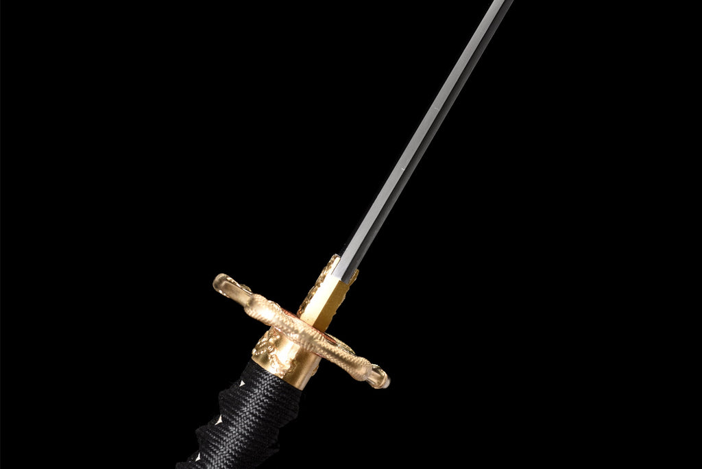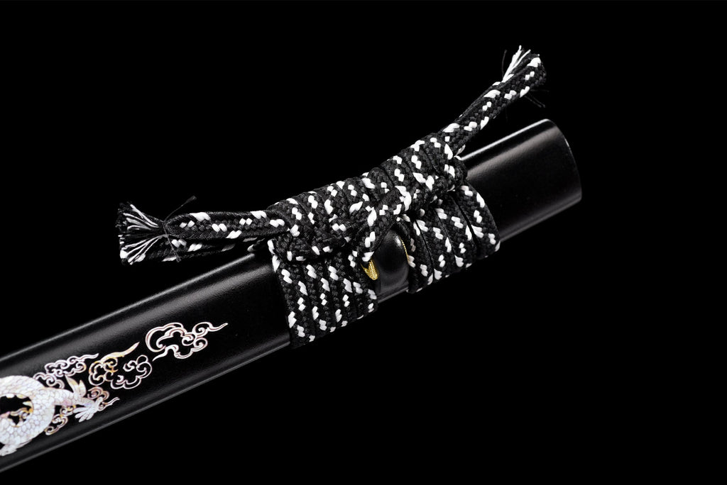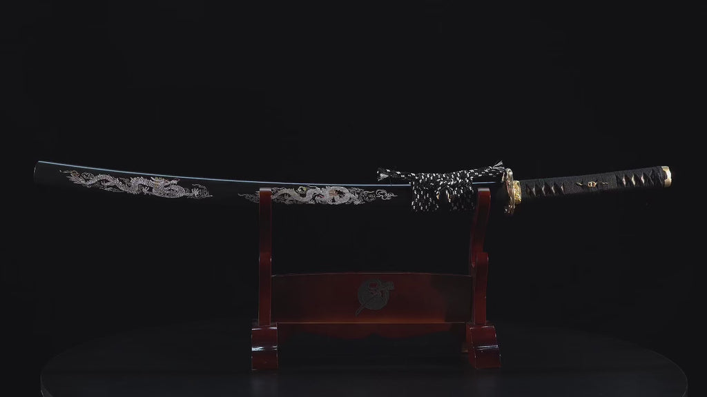 Denna "Ryū no Hōkō" katana utmärker sig genom sitt högkvalitativa T10-stål, tillverkat med ett fint förtennat Hamon som framhäver dess delikatess och hållbarhet. Varje komponent är utvald för sin kvalitet och äkthet, vilket skapar ett svärd med exceptionell skönhet och funktionalitet.